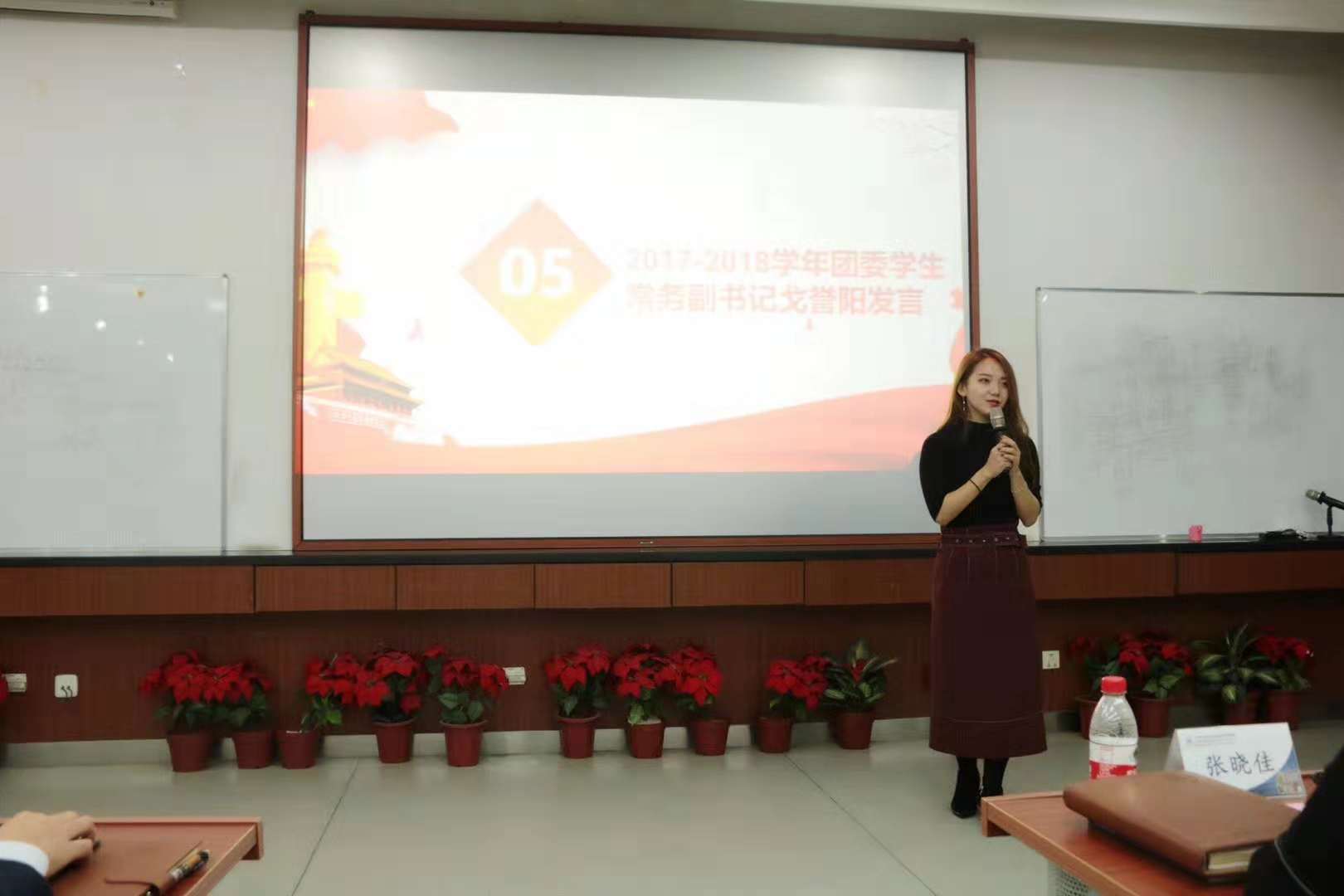 首先,张晓佳老师、邓张升老师、刘璐老师依次为2017-2018学年团委、学生会、管理协会学生书记们颁发纪念牌,现任主席团也为上一届学生书记们送上精心准备的礼物。并播放现任主席团准备的MV《干杯》,现场笑声不断,气氛活跃。